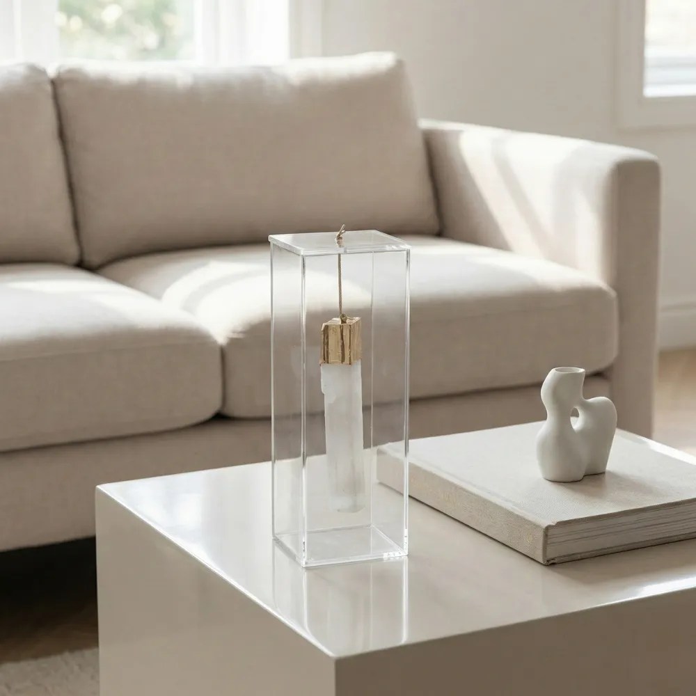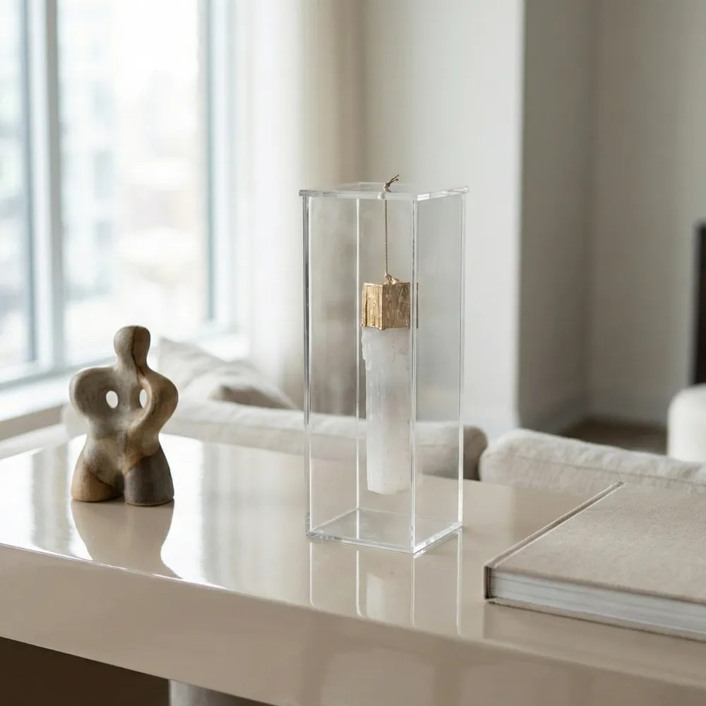 A transparência do acrílico destaca a selenita em sua forma natural, revelando luminosidade suave e textura delicada.