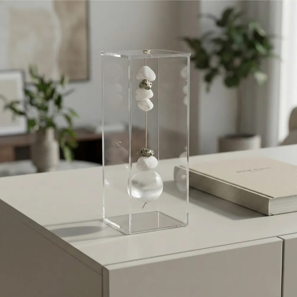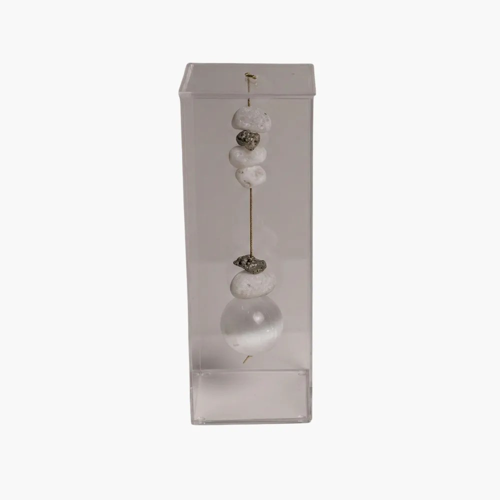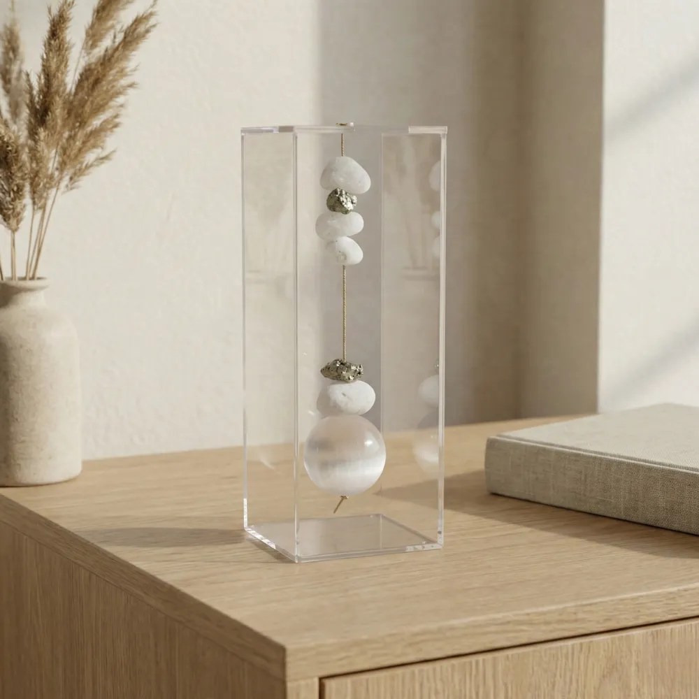 A transparência do acrílico cria um enquadramento leve, evidenciando a pureza luminosa da selenita.