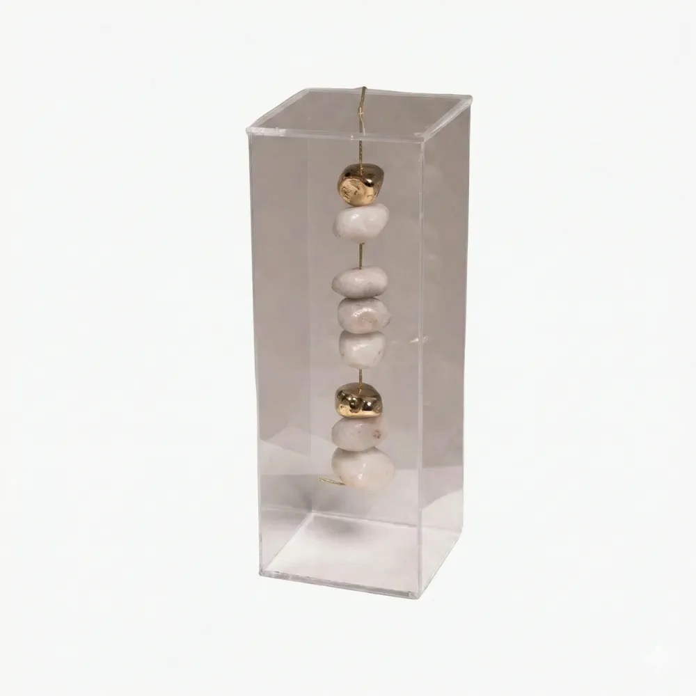 A transparência do acrílico evidencia a suavidade do cristal leitoso, revelando sua tonalidade clara e textura delicada.