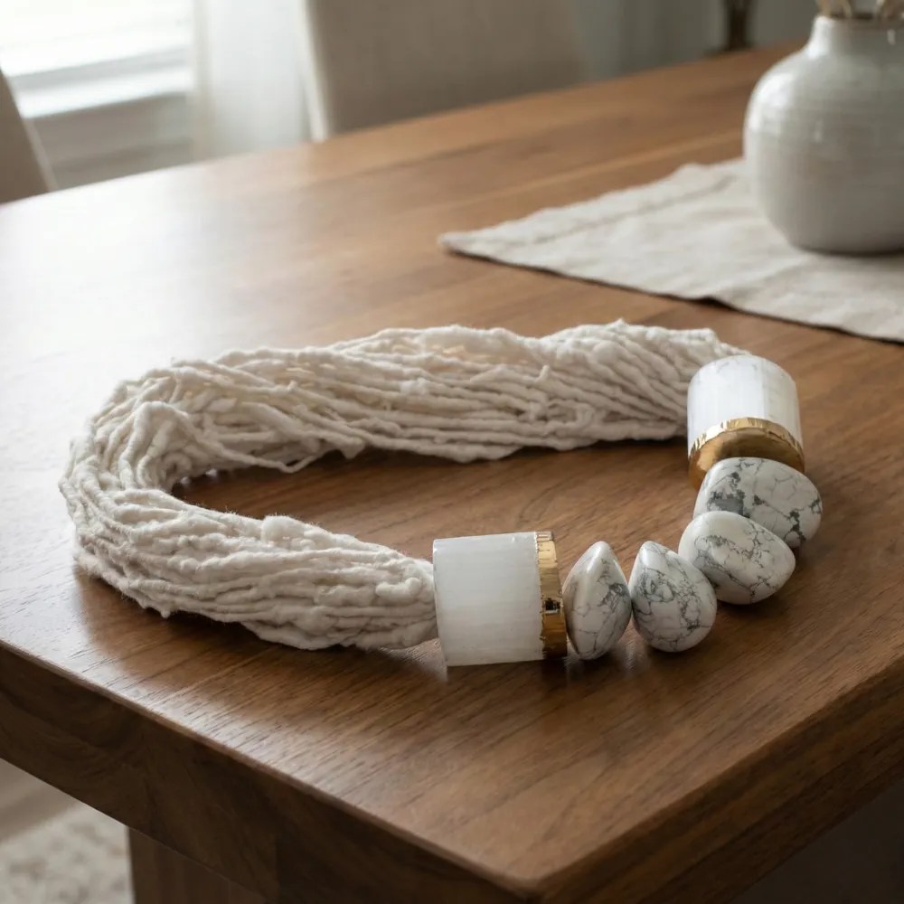 A selenita apresenta transparência suave, enquanto a howlita evidencia veios naturais delicados; o banho em ouro 18k acrescenta brilho sutil e contraste equilibrado.