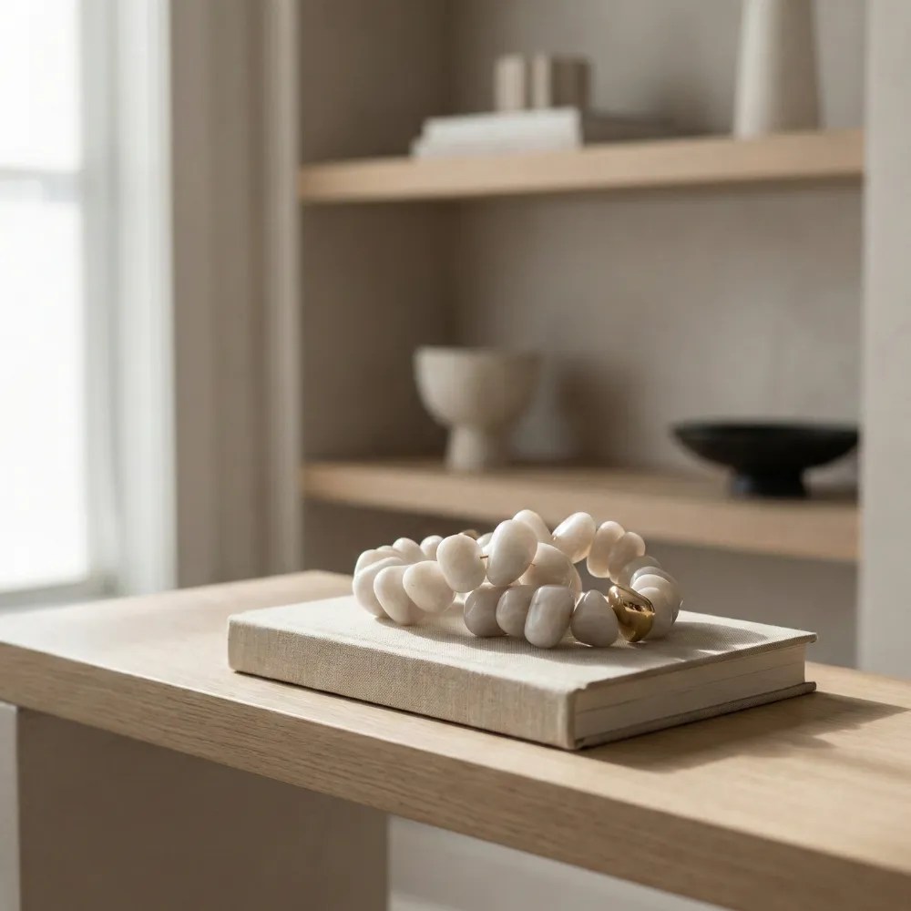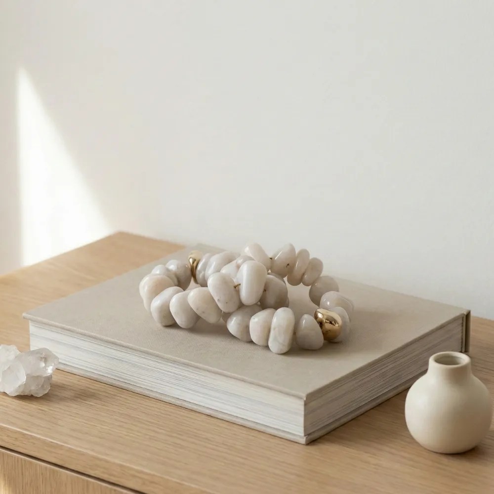 A ágata branca apresenta superfície suave e tonalidade clara, transmitindo leveza visual e elegância atemporal.