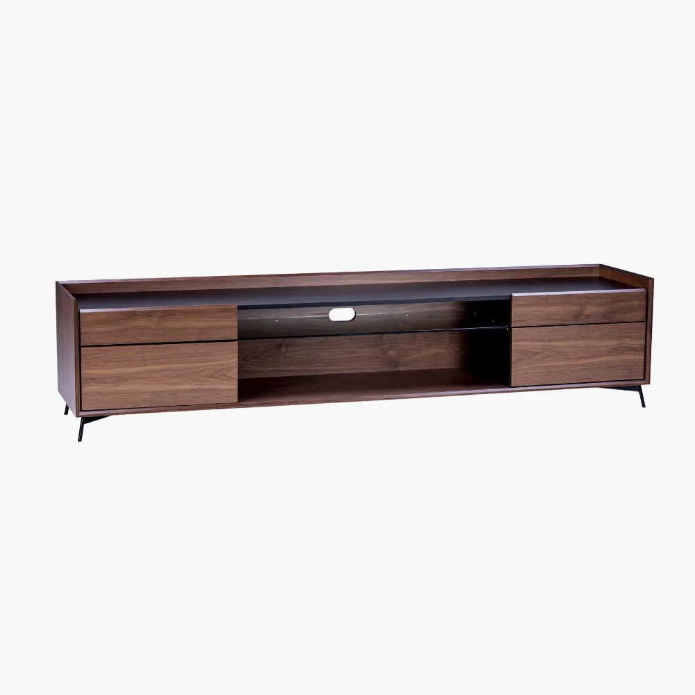 Produto elaborado em MDF revestido com lâmina natural de Nogueira e peças laqueadas. O acabamento das peças é em verniz PU (Poliuretano), com uma prateleira central em vidro